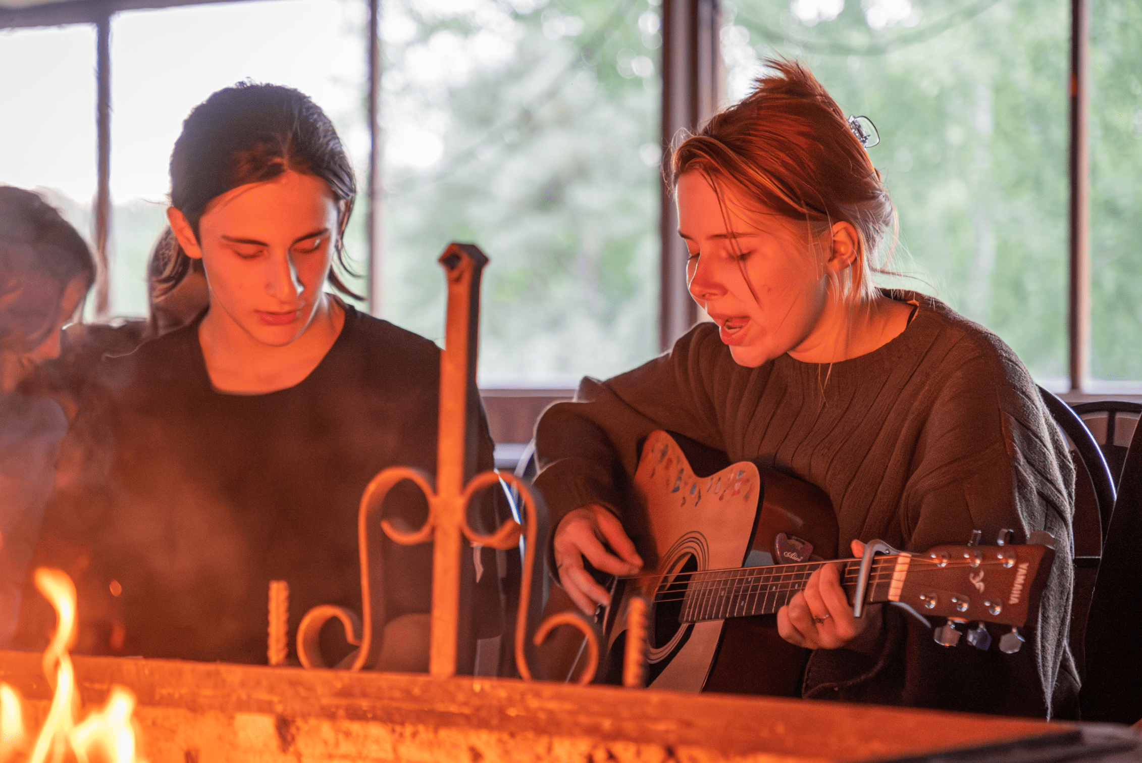 За окном уже стемнело, отблески костра пляшут на лицах, хор голосов поет любиме песни.